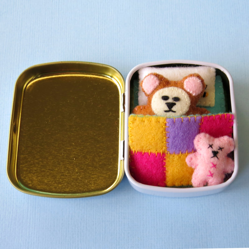 "Who knew that a bear (and his own teddy bear!) could fit in such a tiny tin?! I am in awe of this artist’s needlework. She makes the tiniest creations and embellishes each piece with even tinier embroidered details. She packages very well and ships quickly. Thank you for this small wonder!" |